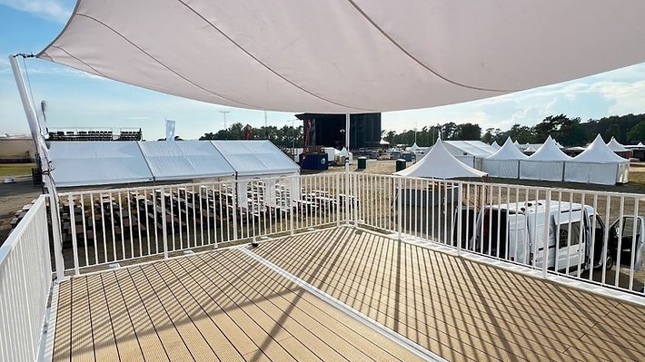 ✅ Terrasse en bois composite, avec pare-soleil réglable, offrant une vue imprenable et un espace pour des réunions ou zones VIP
